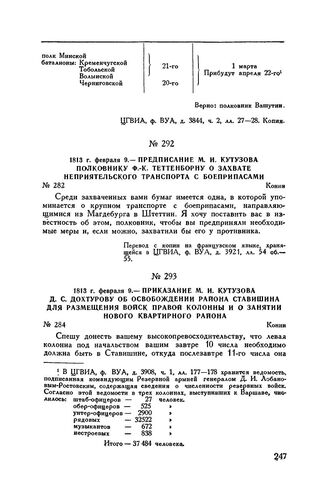 1813 г. февраля 9. — Предписание М.И. Кутузова полковнику Ф.-К. Теттенборну о захвате неприятельского транспорта с боеприпасами. Конин // Перевод с копии на французском языке, хранящейся в ЦГВИА, ф. ВУА, д. 3921, лл. 54 об.-55.