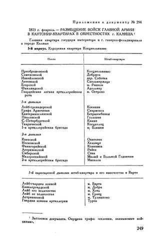 Приложение к приказанию М.И. Кутузова А.П. Тормасову. 1813 г. февраль. — Размещение войск Главной армии в кантонир-квартирах в окрестностях г. Калиша // ЦГВИА, ф. ВУА, д. 3875, лл. 1 и об., 4 и об. Копия.