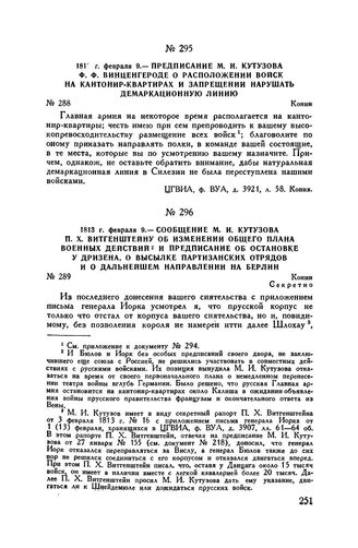 1813 г. февраля 9. — Сообщение М.И. Кутузова П.X. Витгенштейну об изменении общего плана военных действий и предписание об остановке у Дризена, о высылке партизанских отрядов и о дальнейшем направлении на Берлин. Конин // ЦГВИА, ф. ВУА, д. 3904, ч. 1, лл. 80-81. Подлинник. Опублик. со значительными отклонениями в кн.: А.И. Михайловский-Данилевский, «Описание войны 1813 года», ч. 1, СПБ, 1840, стр. 65-66; в сб. «Фельдмаршал Кутузов», 1947, стр. 264-265 опублик. полностью с копии, хранящейся в ЦГВИА, ф. ВУА, д. 3921, л. 58 и об.