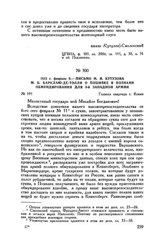 1813 г. февраля 9. — Письмо М.И. Кутузова М.Б. Барклаю-де-Толли о пошивке в Познани обмундирования для 3-й Западной армии. Главная квартира г. Конин