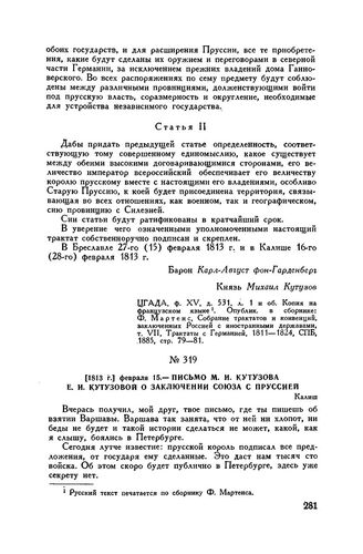 1813 г. февраля 15. — Письмо М.И. Кутузова Е.И. Кутузовой о заключении союза с Пруссией. Калиш // Архив Института литературы Академии наук СССР, ф. 358, оп. 1, кн. 2, л. 37, № 86/378. Автограф. Опублик. в журн. «Русская старина», 1872, т. V, стр. 692.