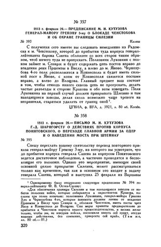 1813 г. февраля 26. — Предписание М.И. Кутузова генерал-майору Грекову 3-му о блокаде Ченстохова и об охране границы Силезии. Калиш // ЦГВИА, ф. ВУА, д. 3921, л. 80 об. Копия.