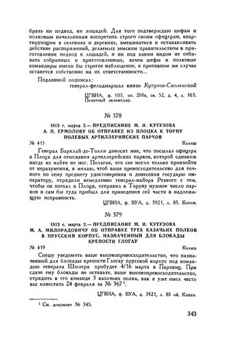 1813 г. марта 2. — Предписание М.И. Кутузова М.А. Милорадовичу об отправке трех казачьих полков в прусский корпус, назначенный для блокады крепости Глогау. Калиш // ЦГВИА, ф. ВУА, д. 3921, л. 85 об. Копия.