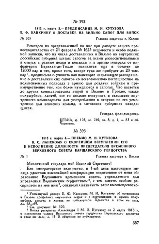 1813 г. марта 3. — Предписание М.И. Кутузова Е.Ф. Канкрину о доставке из Вильно сапог для войск. Главная квартира г. Калиш // ЦГВИА, ф. 103, оп. 210, св. 8, д. 1, л. 83 и об. Черновик.