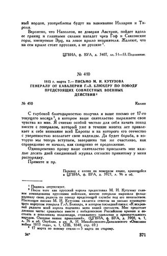 1813 г. марта 7. — Письмо М.И. Кутузова генералу от кавалерии Г.-Л. Блюхеру по поводу предстоящих совместных военных действий. Калиш // Перевод с копии на немецком языке, хранящейся в ЦГВИА, ф. ВУА, д. 3921, л. 96 и об.