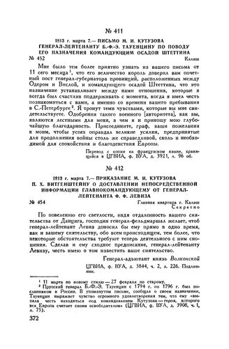 1813 г. марта 7. — Письмо М.И. Кутузова генерал-лейтенанту Б.-Ф.-Э. Тауенцину по поводу его назначения командующим осадой Штеттина. Калиш // Перевод с копии на французском языке, хранящейся в ЦГВИА, ф. ВУА, д. 3921, л. 96 об.