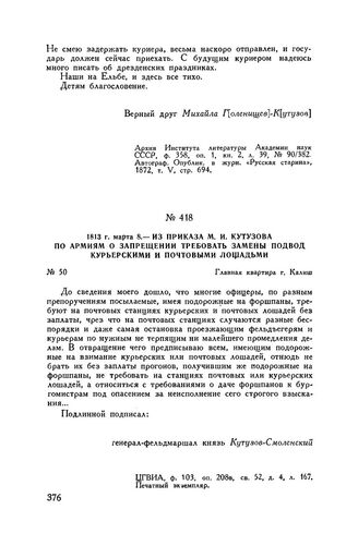 1813 г. марта 8. — Из приказа М.И. Кутузова по армиям о запрещении требовать замены подвод курьерскими и почтовыми лошадьми. Главная квартира г. Калиш