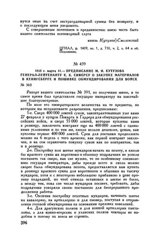 1813 г. марта 11. — Предписание М.И. Кутузова генерал-лейтенанту К.К. Сиверсу о закупке материалов в Кенигсберге и пошивке обмундирования для войск // ЦГИАЛ, ф. 1409, оп. 1, д. 710, ч. 2, лл. 60-62 об. Копия.