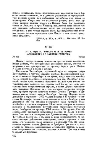 1813 г. марта 14. — Рапорт М.И. Кутузова Александру I о занятии Гамбурга. Калиш // ЦГИАЛ, ф. 1409, оп. 1, д. 710, ч. 2, лл. 65-66 об. Подлинник. Опублик. в прибавлении в газ. «Санктпетербургские ведомости» № 27, 4 апреля 1813 г.