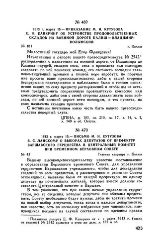 1813 г. марта 13. — Приказание М.И. Кутузова Е.Ф. Канкрину об устройстве продовольственных складов на военной дороге Калиш — Владимир-Волынский. г. Калиш // ЦГВИА, ф. 103, оп. 210, св. 17, д. 34, ч. 1, л. 140 и об. Отпуск.