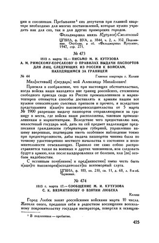 1813 г. марта 16. — Письмо М.И. Кутузова А.М. Римскому-Корсакову о правилах выдачи паспортов для лиц, следующих из России к войскам, находящимся за границей. Главная квартира г. Калиш // ЦГВИА, ф. 103, оп. 210, св. 11, д. 68, л. 8 и об. Черновик.