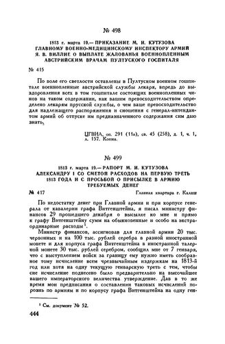1813 г. марта 19. — Приказание М.И. Кутузова главному военно-медицинскому инспектору армий Я.В. Виллие о выплате жалованья военнопленным австрийским врачам Пултуского госпиталя // ЦГВИА, оп. 291 (11а), св. 45 (258), д. 1, ч. 1, л. 157. Копия.
