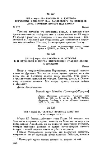 1813 г. марта 24. — Письмо М.И. Кутузова Е.И. Кутузовой о скором выступлении Главной армии к Дрездену. Калиш // Архив Института литературы Академии наук СССР, ф. 358, оп. 1, кн. 2, л. 43, № 98/390. Автограф. Опублик. в журн. «Русская старина», 1872, т. V, стр. 696.