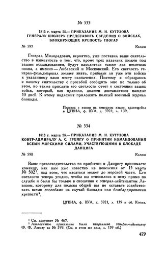 1813 г. марта 25. — Приказание М.И. Кутузова контр-адмиралу А.С. Грейгу о принятии командования всеми морскими силами, участвующими в блокаде Данцига. Калиш