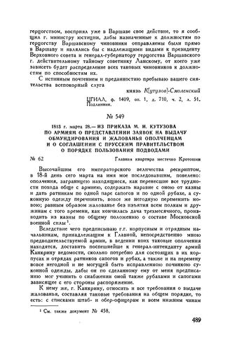 1813 г. марта 28. — Из приказа М.И. Кутузова по армиям о представлении заявок на выдачу обмундирования и жалованья ополченцам и о соглашении с прусским правительством о порядке пользования подводами. Главная квартира местечко Кротошин // ЦГВИА, ф. 103, оп. 208в, св. 52, д. 4, л. 225. Печатный экземпляр.