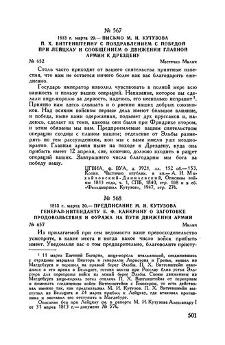 1813 г. марта 30. — Предписание М.И. Кутузова генерал-интенданту Е.Ф. Канкрину о заготовке продовольствия и фуража на пути движения армии. Милич // ЦГВИА, ф. ВУА, д. 3921, лл. 153 об.-154. Копия.