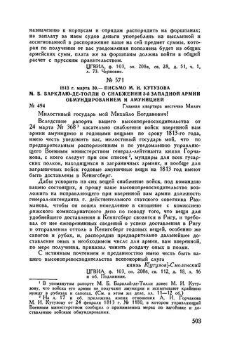 1813 г. марта 30. — Письмо М.И. Кутузова М.Б. Барклаю-де-Толли о снабжении 3-й Западной армии обмундированием и амуницией. Главная квартира местечко Милич