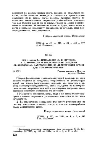 1813 г. апреля 3. — Приказание М.И. Кутузова А.П. Тормасову о представлении сведений об эскадронах, направленных из действующей армии для переформирования. Главная квартира в Пруссии местечко Штейнау // ЦГВИА, ф. 103, оп. 2096, св. 4, д. 1, л. 141, и об. Подлинник.