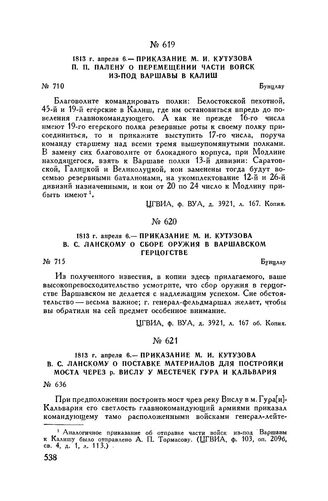 1813 г. апреля 6. — Приказание М.И. Кутузова В.С. Ланскому о поставке материалов для постройки моста через р. Вислу у местечек Гура и Кальвария // ЦГВИА, оп. 291 (11а), св. 45 (258), д. 1, ч. 1 л. 213 и об. Копия.