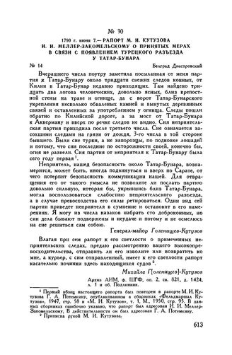 1790 г. июня 7. — Рапорт М.И. Кутузова И.И. Меллер-Закомельскому о принятых мерах в связи с появлением турецкого разъезда у Татар-Бунара. Белград Днестровский // Архив АИМ, ф. ШГФ, оп. 2. св. 821, д. 1424, л. 1 и об. Подлинник.