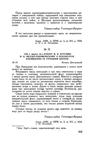 1790 г. августа 19. — Рапорт М.И. Кутузова И.И. Меллер-Закомельскому о результатах наблюдения за турецким флотом. Белград Днестровский // Архив АИМ, ф. ШГФ, оп. 2, св. 821, д. 1424, л. 22. Подлинник.