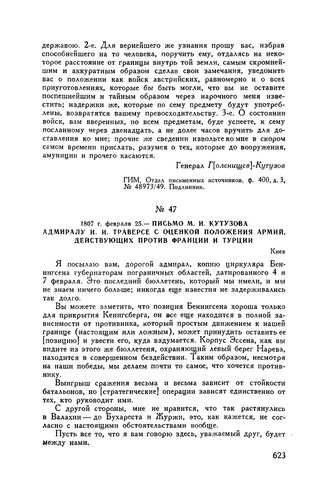 1807 г. февраля 25. — Письмо М.И. Кутузова адмиралу И.И. Траверсе с оценкой положения армий, действующих против Франции и Турции. Киев // Перевод с подлинника на французском языке, хранящегося в ЦГАВМФ, ф. 25, оп. 1, д. 57, л. 1.
