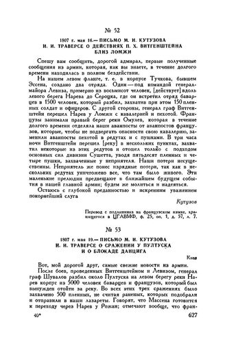 Главная Русские полководцы Кутузов М.И. Кутузов Т5 Документы 1807 г. мая 19. — Письмо М.И. Кутузова И.И. Траверсе о сражении у П...