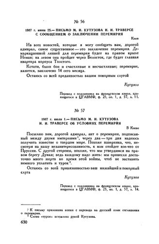1807 г. июня 25. — Письмо М.И. Кутузова И.И. Траверсе с сообщением о заключении перемирия. Киев // Перевод с подлинника на французском языке, хранящегося в ЦГАВМФ, ф. 25, оп. 1, д. 57, л. 11.
