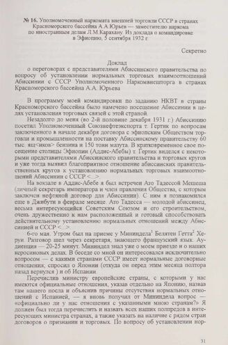 Уполномоченный наркомата внешней торговли СССР в странах Красноморского бассейна А. А. Юрьев — заместителю наркома по иностранным делам Л. М. Карахану. Из доклада о командировке в Эфиопию, 5 сентября 1932 г. // АВП РФ, ф. 0143, oп. 1, п. 1, д. 11, л. 36-37. Копия.
