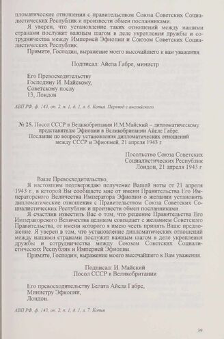 Посол СССР в Великобритании И. М. Майский - дипломатическому представителю Эфиопии в Великобритании Айеле Габре. Послание по вопросу установления дипломатических отношений между СССР и Эфиопией, 21 апреля 1943 г. // АВП РФ, ф. 143, oп. 2, п. 1, д. 1, л. 7. Копия.