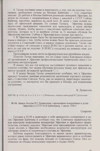Запись беседы В. Г. Деканозова с временным поверенным в делах Эфиопии в СССР М. И. Бабичевым, 1 июня 1946 г.