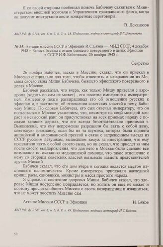 Атташе миссии СССР в Эфиопии И. С. Бяков — МИД СССР. 4 декабря 1948 г. Запись беседы с отцом бывшего поверенного в делах Эфиопии в СССР И. Ф. Бабичевым, 26 ноября 1948 г.