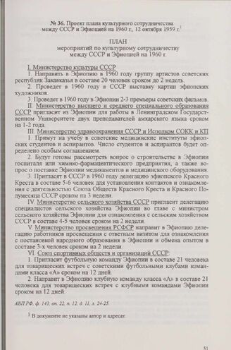 Проект плана культурного сотрудничества между СССР и Эфиопией на 1960 г, 12 октября 1959 г. // АВП РФ, ф. 143, oп. 22, п. 12, д. 11, л. 24-25.