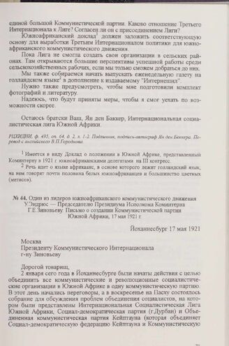Один из лидеров южноафриканского коммунистического движения У. Эндрюс — Председателю Президиума Исполкома Коминтерна Г. Е. Зиновьеву. Письмо о создании Коммунистической партии Южной Африки. Йоханнесбург, 17 мая 1921 г.