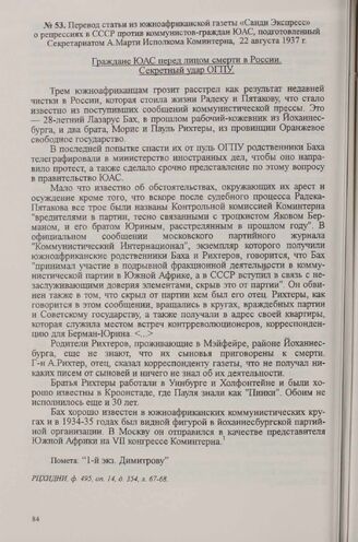 Перевод статьи из южноафриканской газеты «Санди Экспресс» о репрессиях в СССР против коммунистов-граждан ЮАС, подготовленный Секретариатом А. Марти Исполкома Коминтерна, 22 августа 1937 г. // РЦХИДНИ, ф. 495, oп. 14, д. 354, л. 67-68.