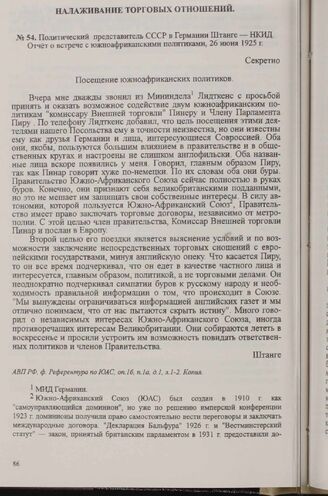 Политический представитель СССР в Германии Штанге — НКИД. Отчет о встрече с южноафриканскими политиками, 26 июня 1925 г.