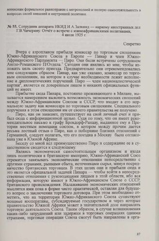 Сотрудник аппарата НКИД И. А. Залкинд — наркому иностранных дел Г. В. Чичерину. Отчёт о встрече с южноафриканскими политиками, 4 июля 1925 г.
