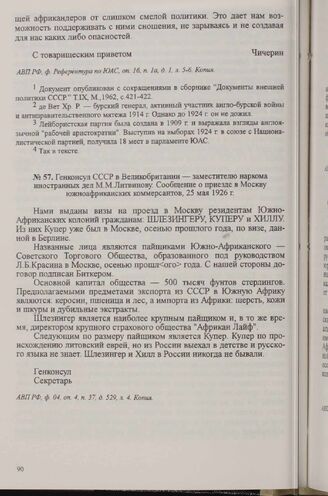 Генконсул СССР в Великобритании — заместителю наркома иностранных дел М. М. Литвинову. Сообщение о приезде в Москву южноафриканских коммерсантов, 25 мая 1926 г. // АВП РФ, ф. 04, oп. 4, п. 37, д. 529, л. 4. Копия.