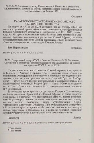 Генеральный консул СССР в Лондоне Языков — М. М. Литвинову. Сообщение о контактах с южноафриканцами, обращающимися за визами для проезда в СССР, 21 июля 1926 г. // АВП РФ, ф. 04, oп. 4, п. 37, д. 529, л. 6. Подлинник, подпись-автограф Языкова.