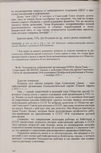 Руководитель кейптаунской организации КПЮА Джон Гомас — Секретариат ЦК ВКП(б). Письмо о делегации Общества друзей Советского Союза на праздновании 18-й годовщины Октябрьской революции в России, 3 октября 1935 г. // РЦХИДНИ, ф. 495, oп. 64, д. 145, л. 18-19. Подлинник, подпись-автограф Джона Гомаса. Перевод с английского В. П. Городнова.