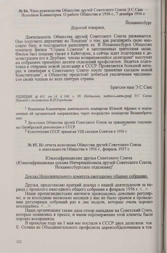 Из отчета исполкома Общества друзей Советского Союза о деятельности Общества в 1936 г, февраль 1937 г. // РЦХИДНИ, ф. 495, oп. 14, д. 353, л. 1-8. Подлинник, подпись-автограф Джулии Крюгер. Перевод с английского В. П. Городнова.