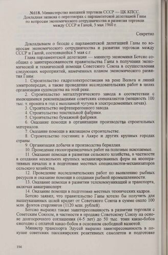 Министерство внешней торговли СССР — ЦК КПСС. Докладная записка о переговорах с парламентской делегацией Ганы по вопросам экономического сотрудничества и развития торговли между СССР и Ганой, 5 мая 1960 г.