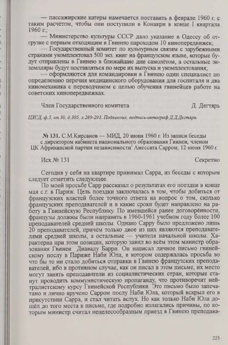С. М. Кирсанов — МИД, 20 июня 1960 г. Из записи беседы с директором кабинета национального образования Гвинеи, членом ЦК Африканской партии независимости Амессата Сарром. 12 июня 1960 г.
