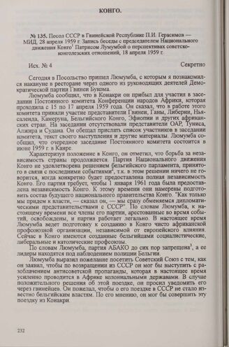 Посол СССР в Гвинейской Республике П. И. Герасимов — МИД, 28 апреля 1959 г. Запись беседы с председателем Национального движения Конго Патрисом Лумумбой о перспективах советско-конголезских отношений, 18 апреля 1959 г.