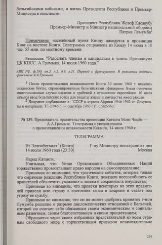 Председатель правительства провинции Катанга Моиз Чомбе А. А. Громыко. Телеграмма с уведомлением о провозглашении независимости Катанги, 14 июля 1960 г. // АВП РФ, ф. 590, oп. 3, п. 2, д. 9, л. 34. Перевод с французского. В резолюции подпись-факсимиле А. А. Громыко.