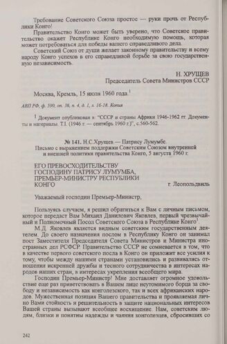 Главная Россия и Африка ХVIII в.-1960 г. Россия и Африка. ХVIII в.-1960 г.: Док. и материалы. Т. II. 1918-19... Н. С. Хрущев — Патрису Лумумбе. Письмо с выражением поддержки Совет...