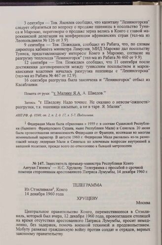 Заместитель премьер-министра Республики Конго Антуан Гизенга — Н. С. Хрущеву. Телеграмма с просьбой о срочной помощи сторонникам арестованного Патриса Лумумбы, 14 декабря 1960 г.