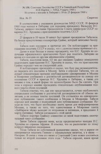 Советник Посольства СССР в Гвинейской Республике И. И. Марчук — МИД, 9 марта 1960 г. Из отчета о поездке в Либерию с 18 по 25 февраля 1960 г.