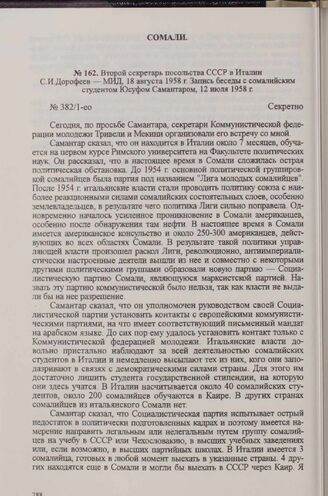 Второй секретарь посольства СССР в Италии С. И. Дорофеев — МИД, 18 августа 1958 г. Запись беседы с сомалийским студентом Юсуфом Самантаром, 12 июля 1958 г.
