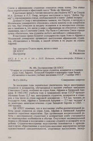 Постановление ЦК КПСС «О мерах по улучшению работы среди студентов, аспирантов и стажеров стран Азии, Африки, Латинской Америки и некоторых стран Запада, обучающихся в высших учебных заведениях СССР», 3 ноября 1960 г. // ЦХСД, ф. 4, oп. 16, д. 902, л. 28-31. Из протокола заседания Секретариата ЦК КПСС № 166 от 29 октября I960 г. Копия.